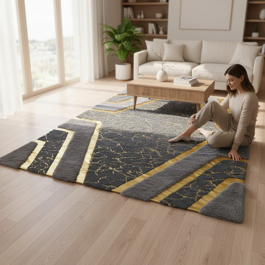 1.5 x 2m 3D Abstract Marble Design Carpet Black & Gold
