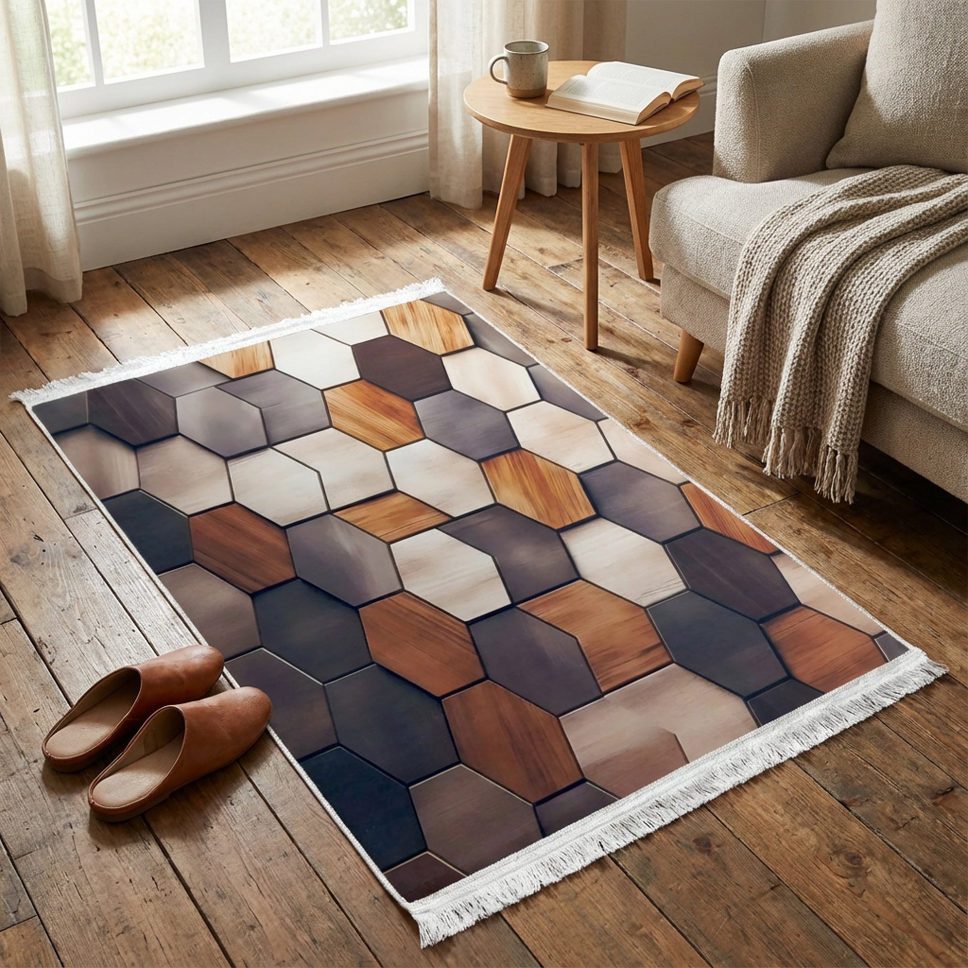 Transform your space with this striking hexagon design carpet. The multicoloured geometric pattern adds contemporary flair to any room, blending modern aesthetics with versatile appeal. Measuring 1 x 1.5m, it's perfectly sized for defining living areas, bedrooms, or home offices without overwhelming the space. The bold hexagon motif creates visual interest while the varied colour palette complements both neutral and vibrant décor schemes. Ideal for shoppers seeking statement pieces that balance style with practicality.