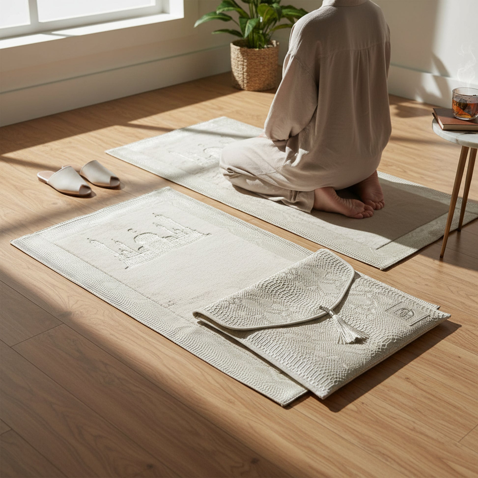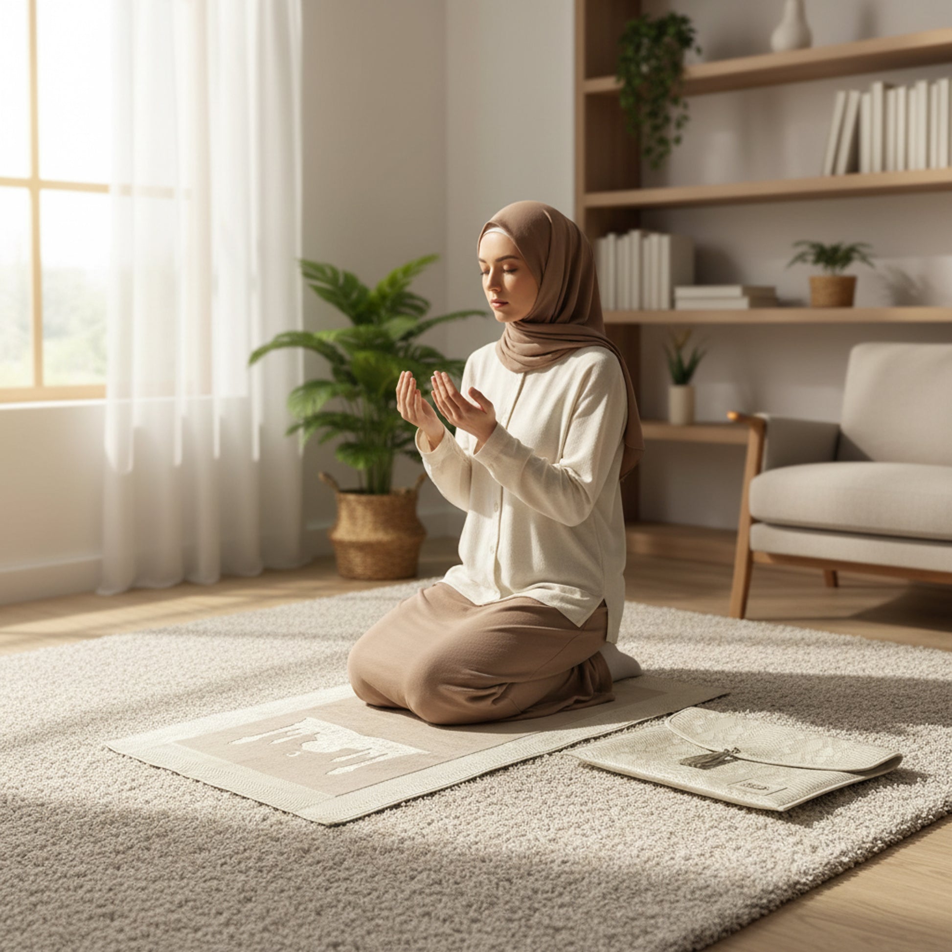 Elevate your daily prayers with this elegant musallah set, thoughtfully paired with a premium leather carrying bag. The soft cream-colored prayer mat provides comfort and a serene foundation for your spiritual practice, while the durable leather bag ensures your musallah stays protected and portable wherever you go. Perfect for home use or travel, this coordinated set combines functionality with refined aesthetics—ideal for gifting or personal devotion. A practical investment that honors both tradition and modern convenience.