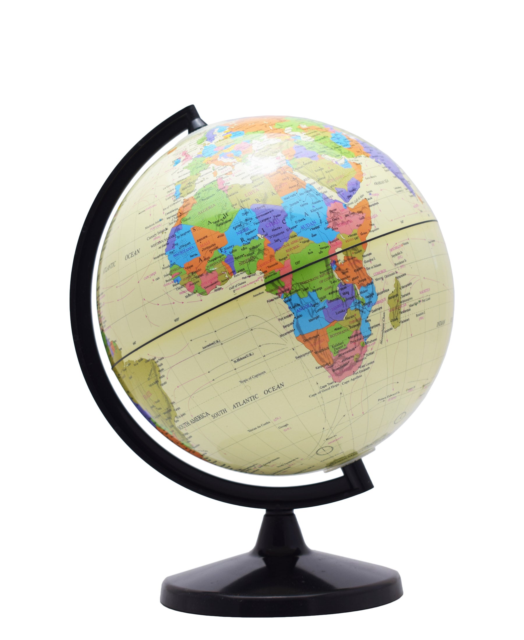Up-to-date retro mapping. Sturdy design. One-axis rotation. Encourages exploration of the world. Perfect for use at home, the office and the classroom. Height including stand: 20cm. Plastic stand and meridian.