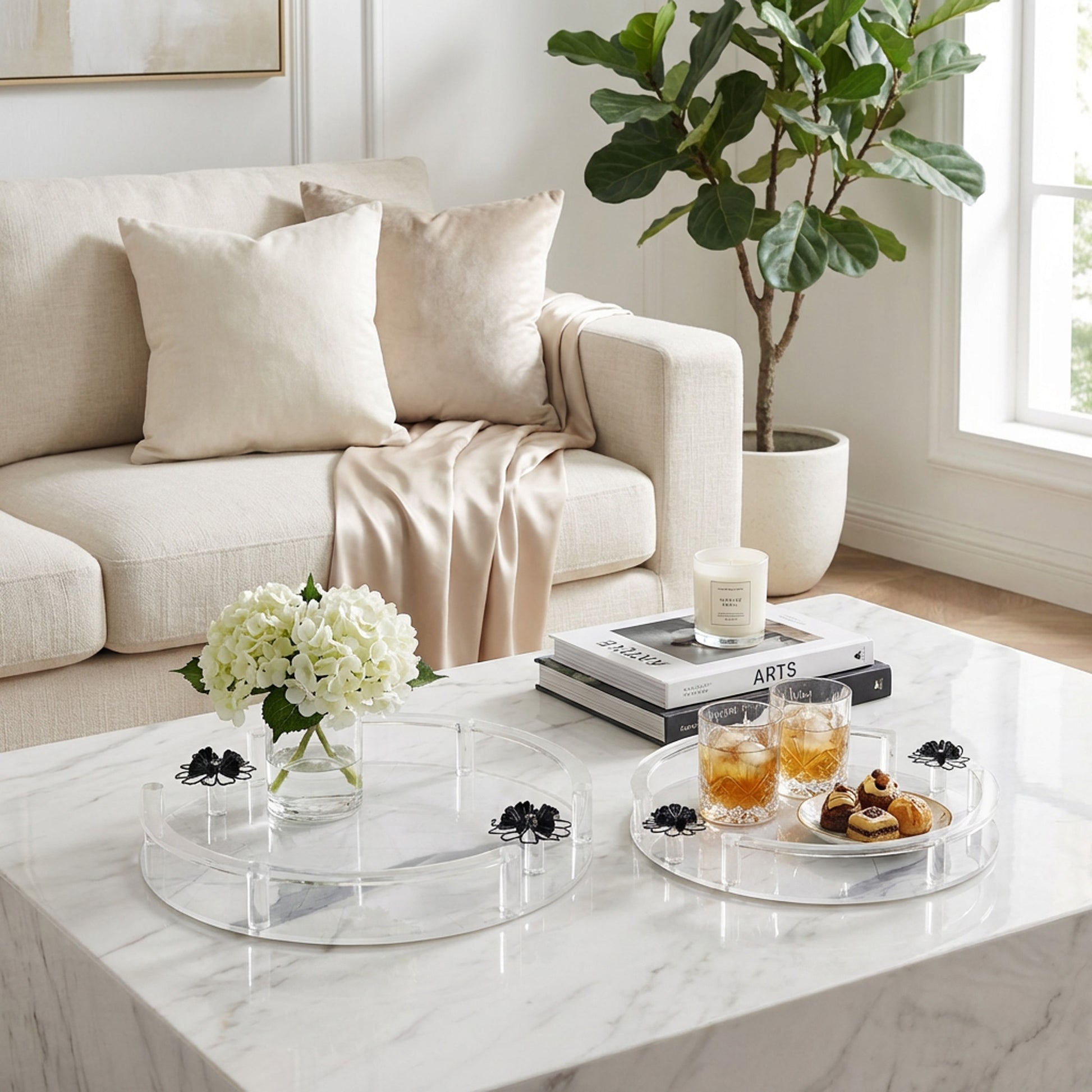 Elevate your entertaining with this stunning two-piece acrylic tray set, featuring delicate floral prints that bring botanical elegance to any room. Crafted from crystal-clear acrylic, these round trays are durable yet refined—perfect for serving refreshments, displaying candles, or organizing your vanity. The lightweight design makes them easy to move between spaces, while the timeless floral motif complements both modern and classic décor. Ideal for gifting or treating yourself to a touch of everyday luxury.